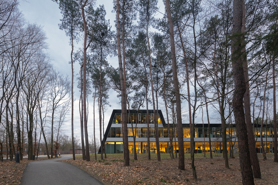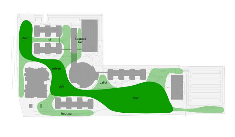 De relatief lage gebouwen zijn subtiel op het terrein geplaatst, waardoor zij de buitenruimte omarmen: Tussen de gebouwen ‘vloeit’ een doorlopende groene ruimte met een variatie in sferen en wisselende doorkijken. Er is een ordening van hoofd- en subruimtes die in elkaar overvloeien. De belangrijkste doorgaande ruimte loopt van de representatieve groene zone aan de Laan van Malkenschoten, naar de entreeruimte bij het vergadercentrum, vervolgens glooiend omhoog naar het houten deck met de terrassen van het restaurant vanwaar het overgaat naar het bos.
